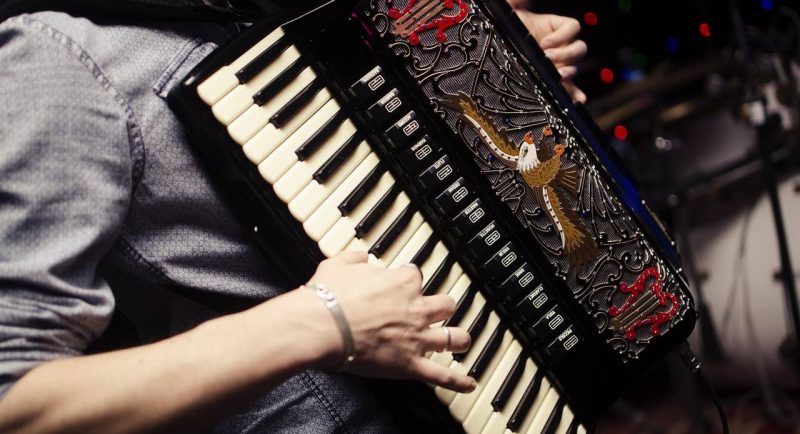 9. Acordeón. A diferencia de otros de la lista, este instrumento musical de viento madera no requiere del aire de los pulmones del intérprete, sino del movimiento de sus manos. El sonido se produce al acercar y alejar las dos cajas de madera en sus extremos, para que el aire del fuelle en el centro, y para modular cada nota se emplea una serie de teclas dispuestas en la caja derecha.