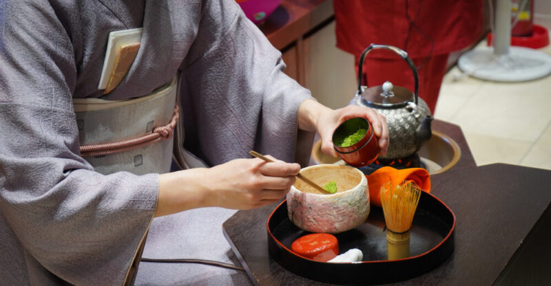 Vinculada con ciertas prácticas del budismo Zen, la ceremonia japonesa del té se lleva a cabo como una forma de agasajar a los invitados de un hogar, preparándoles alguna variedad local de té verde de hojas machacadas. Esta preparación se lleva a cabo como parte de un ritual de gestos y procedimientos muy específicos, utilizando instrumentos tradicionales para obtener el resultado debido. Se trata, al mismo tiempo, de un ritual que ejercita la paciencia y conduce a la serenidad.