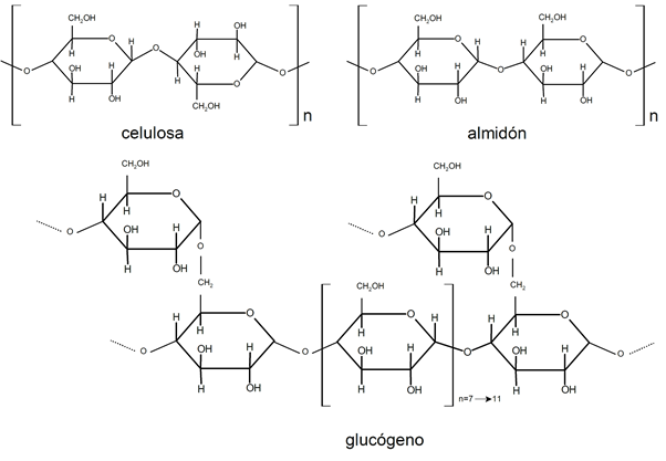- Glucógeno. Formado por cadenas de glucosa, es el principal polisacárido de reserva energética de los animales, alojado en la musculatura y en menor medida en el hígado. Se reduce a glucosa por hidrólisis en situaciones de necesidad energética.