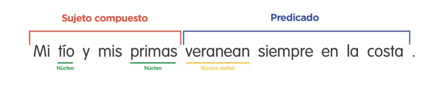 Recuerda: Un núcleo en plural no determina un sujeto compuesto, sino que es necesario que existan dos núcleos distintos. Es decir, lo que define que un sujeto sea compuesto no es la cantidad de elementos que nombra un núcleo, sino la cantidad de sustantivos o pronombres que desempeñan esta función. Por ejemplo: El niño y su padre están dormidos. / Los niños y sus padres están dormidos.