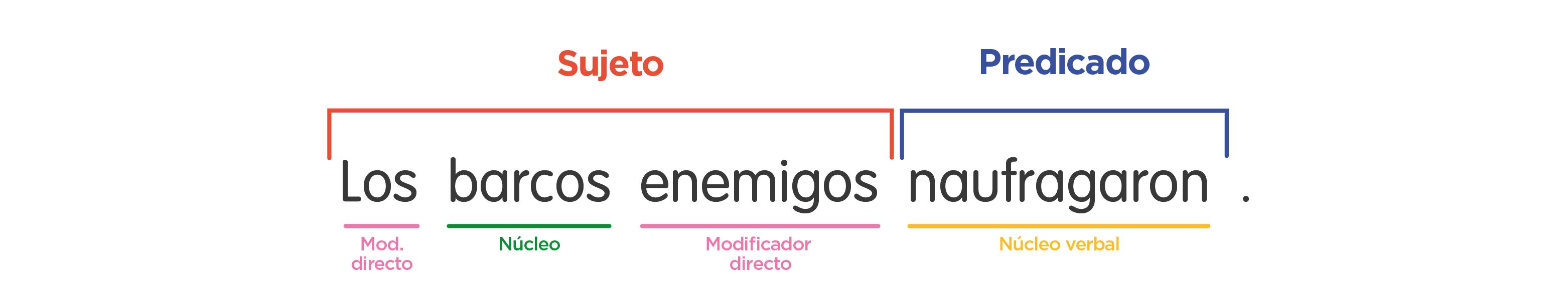 Todas las oraciones bimembres se componen de dos grandes estructuras: un sujeto (quien realiza la acción) y un predicado (la acción que se realiza). Cada una de estas partes tiene un núcleo, que por lo general va acompañado de modificadores que lo complementan y aportan más información sobre él. En el caso del sujeto, el núcleo suele ser un sustantivo común, un nombre propio o un pronombre, y los modificadores pueden ser directos o indirectos.