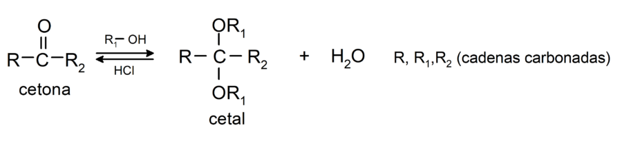 Adicionan alcoholes (en presencia de ácidos anhidros) al grupo carbonilo de las cetonas para formar cetales y hemicetales. Por ejemplo: