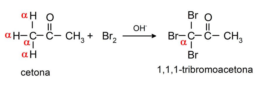 Experimentan reacciones de halogenación. Las cetonas que tienen un hidrógeno alfa (α) reaccionan por sustitución de este hidrógeno por halógenos (cloro (Cl), bromo (Br), yodo (I), flúor (F)) en presencia catalizadores ácidos o básicos. La sustitución se produce casi exclusivamente en el carbono α, es decir, el carbono que tiene unido al hidrógeno α. Por ejemplo: