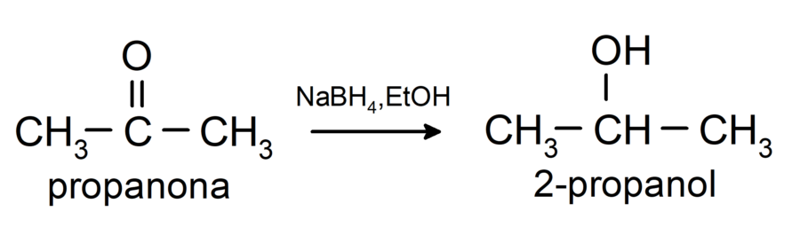 Se reducen a alcoholes secundarios por hidrogenación catalítica o por reducción con borohidruro de sodio (NaBH4) e hidruro de litio y aluminio (LiAlH4). Por ejemplo: