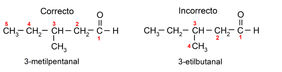 Si el aldehído está formado por varias cadenas carbonadas, o sea, que tiene ramificaciones, se elige como cadena principal la cadena carbonada con mayor cantidad de átomos de carbono. Las demás cadenas son nombradas como grupos sustituyentes, y la posición de cada sustituyente, se elige de forma que ocupe la menor numeración posible en la cadena. Además, se comienzan a contar los átomos de carbono empezando por el extremo que tiene el grupo carbonilo. Por ejemplo: