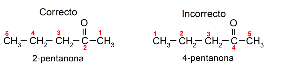Por otra parte, se escribe el nombre de la acetona utilizando el sufijo -ona, precedido por un número que indica la posición del grupo carbonilo en la cadena carbonada. La ubicación del grupo carbonilo se debe elegir de tal forma que le corresponda a la menor numeración posible. Por ejemplo: