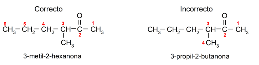 Para nombrar una cetona que está formada por varias cadenas carbonadas, es decir, con ramificaciones, se elige como cadena principal la cadena carbonada con mayor cantidad de átomos de carbono y que contiene al grupo carbonilo. El resto de las cadenas se nombran como grupos sustituyentes. Por ejemplo:
