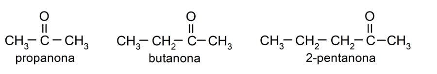 Las cetonas son compuestos orgánicos que tienen en su estructura un grupo carbonilo enlazado a dos átomos de carbono. Por ejemplo: la propanona (también llamada acetona), la butanona y la 2-pentanona.