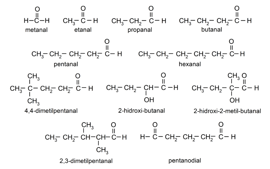 Los aldehídos son compuestos orgánicos que tienen en su estructura un grupo funcional carbonilo (= C = O) que está enlazado a una cadena carbonada y a un átomo de hidrógeno. Por ejemplo: el metanal (también llamado formaldehído), el etanal (también llamado acetaldehído) y el propanal (también llamado propaldehído).