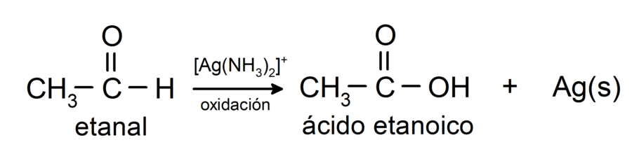 - La oxidación con el reactivo de Tollens (complejo de plata amoniacal en solución básica, [Ag(NH3)2]+) del etanal produce ácido etanoico y plata metálica..