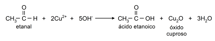 - La oxidación con el reactivo de Benedict (solución alcalina de sulfato de cobre) del etanal produce ácido etanoico y óxido cuproso.