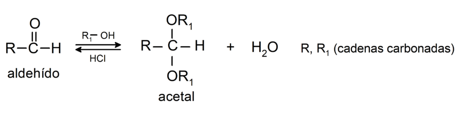 - En presencia de ácidos anhidros, se adicionan alcoholes al grupo carbonilo de los aldehídos para formar acetales y hemiacetales.