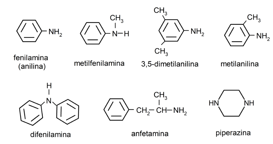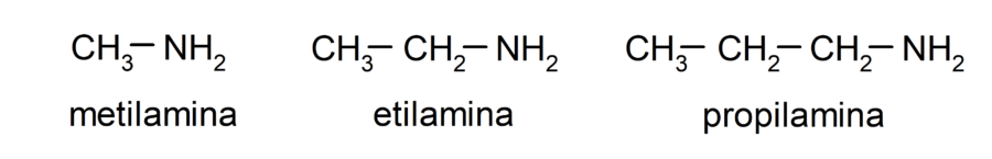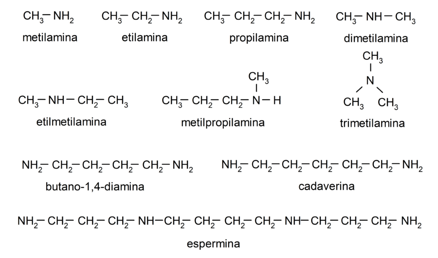 Las aminas son compuestos químicos orgánicos derivados del amoníaco (NH3), donde al menos uno de los hidrógenos del amoníaco ha sido sustituido por un grupo alquilo o arilo, lo que dio como resultado la formación de un grupo amino (-NH2, -NH-, -N=). Por ejemplo: metilamina, etilamina y propilamina.