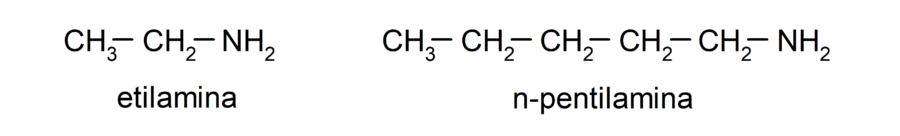 - Aminas primarias. Se forman cuando solo uno de los átomos de hidrógeno del amoníaco es sustituido por un grupo alquilo o arilo. Por ejemplo: etilamina y 1-pentilamina.