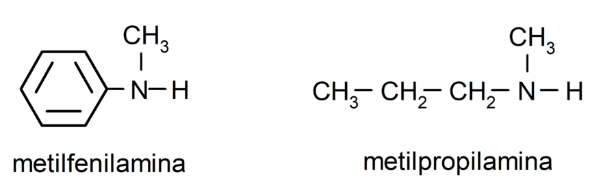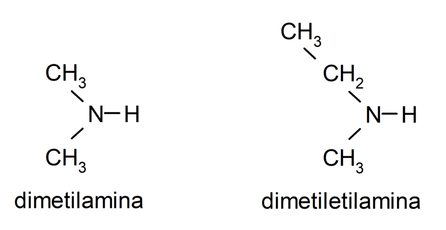 - Aminas secundarias. Se forman cuando dos de los átomos de hidrógeno del amoníaco son sustituidos por un grupo alquilo o arilo. Por ejemplo: dietilamina y etilmetilamina.