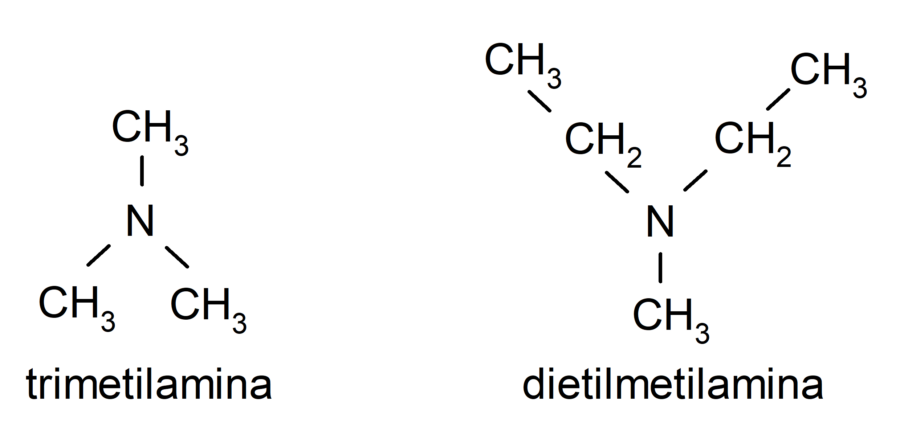 - Aminas terciarias. Se forman cuando los tres átomos de hidrógeno del amoníaco son sustituidos por un grupo alquilo o arilo. Por ejemplo: trimetilamina y dimetiletilamina.
