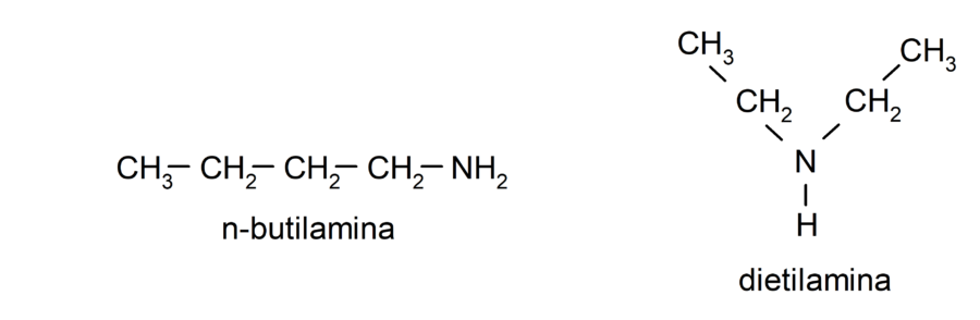 - Aminas alifáticas. Presentan sustituyentes alquilo. Por ejemplo: butilamina y dietilamina.