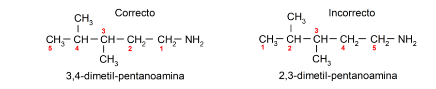 Para aminas que contienen varias cadenas carbonadas (que a su vez, tienen otros sustituyentes), se elige como principal la cadena carbonada que contiene el grupo amino. Además, se elige la posición del grupo amino de manera que ocupe la menor posición en la cadena carbonada, y en base a esta posición, también se eligen los sustituyentes de forma que ocupen la menor posición posible en la cadena.