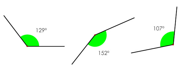 Son los que tienen una amplitud mayor a los 90°, pero menor a los 180°. Si alguna de las dos semirrectas se prolonga más allá del vértice, estará acompañado por uno agudo y darán lugar a los 180°. Si las dos semirrectas se prolonga más que el vértice, habrán dos pares de ángulos opuestos por el vértice para sumar 360°.