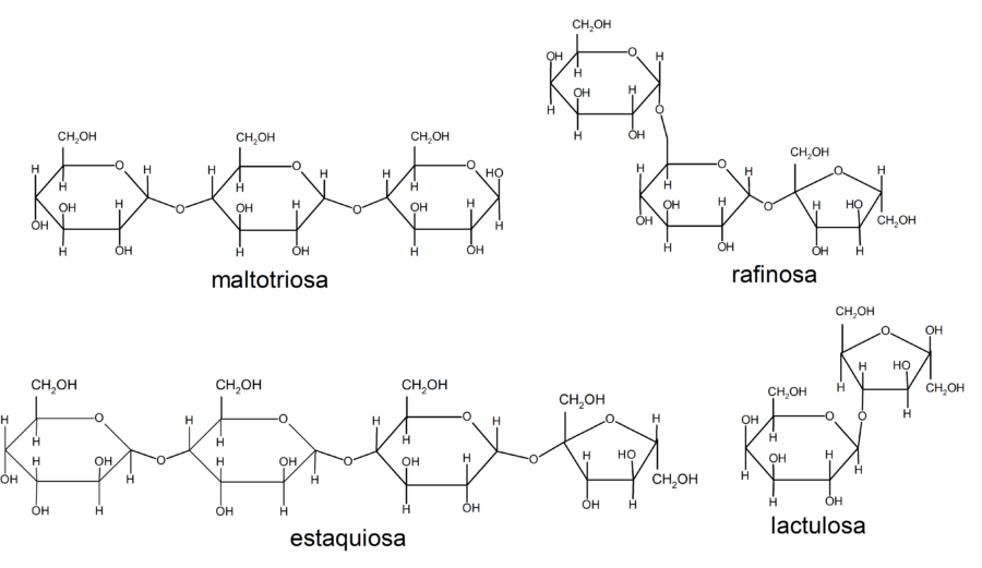 Algunos oligosacáridos, como la rafinosa, pueden encontrarse en algunas legumbres como las lentejas, las judías y los garbanzos. Además, se encuentran en muchos frutos secos como las nueces, las almendras y las avellanas. Por otro lado, los fructo-oligosacáridos están presentes en diversas plantas como el puerro, la cebolla, el ajo, la achicoria y el espárrago.