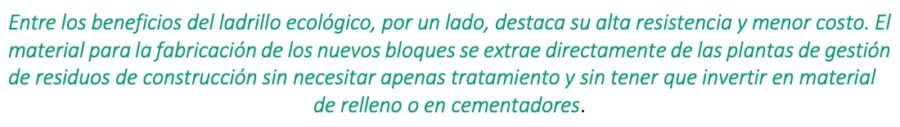 Entre los beneficios del ladrillo ecológico, por un lado, destaca su alta resistencia y menor costo. El material para la fabricación de los nuevos bloques se extrae directamente de las plantas de gestión de residuos de construcción sin necesitar apenas tratamiento y sin tener que invertir en material de relleno (gravas y arenas), o en cementadores (cemento o cal). El procedimiento que siguen los expertos, una vez obtenida la materia prima, es similar al de la fabricación de cualquier tipo de bloque, por lo que no es necesaria ninguna inversión en la industria ladrillera.